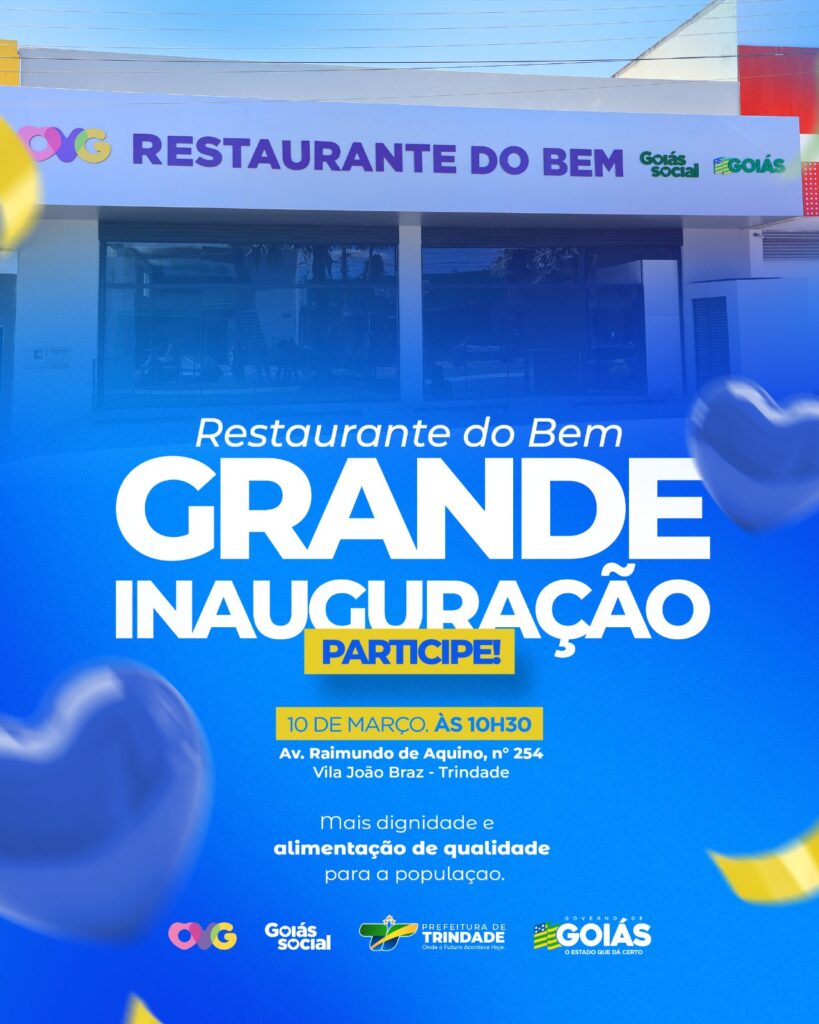Na mesma data, será realizada também a Grande Inauguração do Restaurante do Bem, uma importante iniciativa do Goiás Social em parceria com a Prefeitura de Trindade e o Governo de Goiás, que chega para promover mais dignidade e alimentação de qualidade para a população.