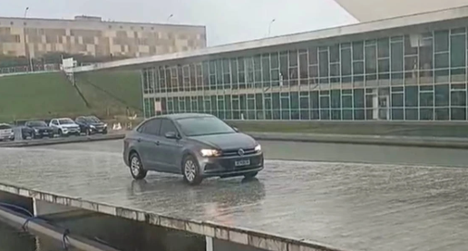 O condutor utilizou a rampa — destinada exclusivamente a pedestres — para deixar um passageiro na entrada do prédio, em meio à chuva que atingia a região no momento.